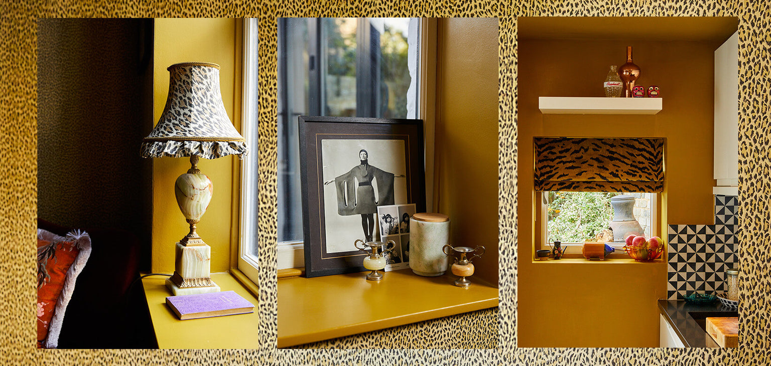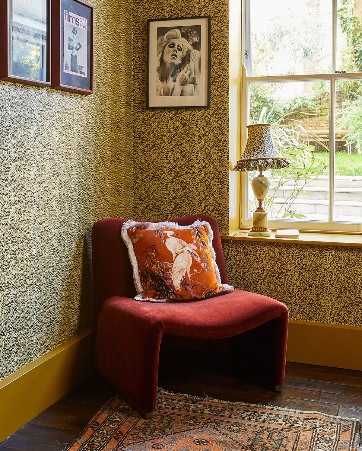And so mote it be. All five walls (the ceiling is a wall in our House), were pasted with WILD CARD wallpaper; natureโs neutral, it goes with everything. A blind was made up in TIGRE print velvet, and the kitchen area and woodwork was coated in our golden ochre toned paint UMBER, bringing the whole thing together in hedonistic harmony. Itโs amazing what a difference a bit of wallpaper on a ceiling can do to a space - the feeling is cocooning and intimate, the perfect setting for a soiree. This scheme doesnโt need to shout to be heard; the neutral โButterscotchโ of our leopard print makes it chic rather than cheap, but still suffused with punk spirit.