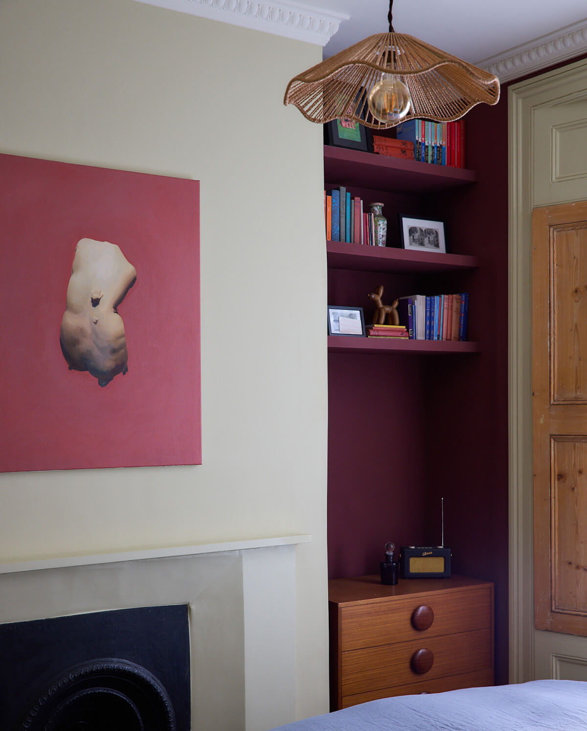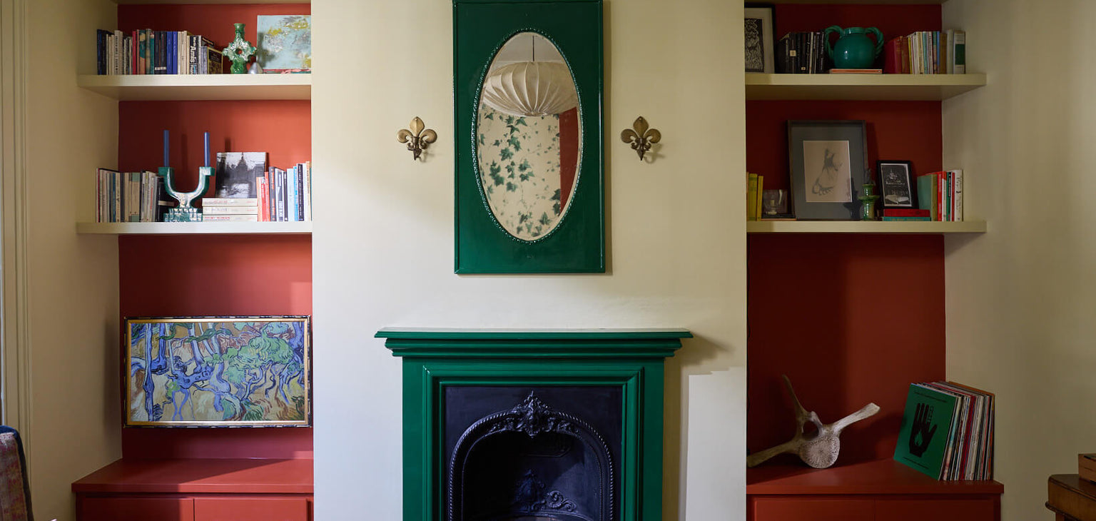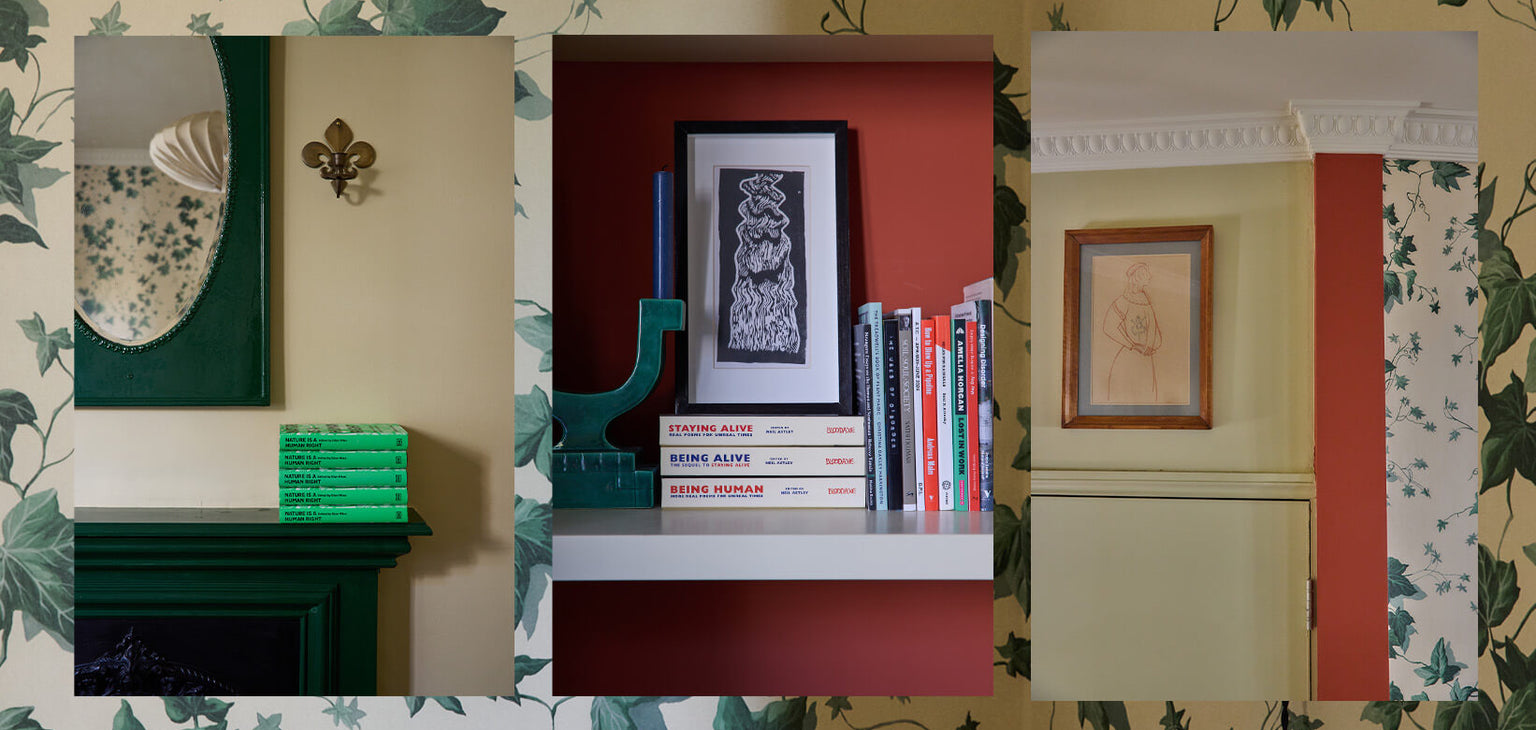 With the high ceilings and original features of a classic London apartment, Ellen’s living room provided the perfect backdrop for our vintage creeping ivy wallpaper, HEDERA. Either side of the green fireplace, Ellen gave the recessed bookshelves a pop of color courtesy of the fiery, orange-red hue LANTANA. The collected green ceramics throughout the space echo the verdant, trailing leaves of the wallpaper creating cohesion, and natural elements like hardwood floors, wooden shutters and rattan light fittings ensure the room has a connection to the natural world that Ellen so fiercely adores.