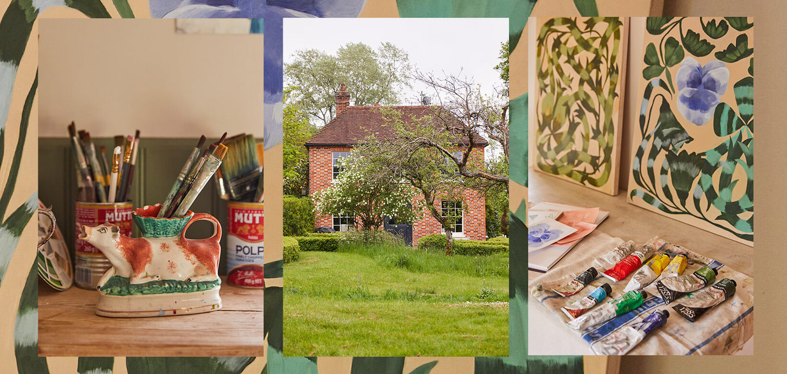 Like the intuitive process of painting, Georgiaโs approach to decorating is visceral, focusing on what feeling a room should evoke rather than following method and trends. The age and history of the space meant she had to let the building guide her somewhat in her interior choices, and maintaining the harmony between the old and new was paramount. As a working studio, the space needed to contain quiet walls for Georgia to work, but be more than just a blank canvas. Design Consultant Steve worked with her to come up with a scheme that, as Georgia put, would โemote but not consumeโ. The wish to bring the outside in led to the beautiful wooded landscape of PLANTASIA, an enchanting pastoral print that doesnโt need to shout to be heard. In โSageโ green, and complemented by paint in forest SAP and oak-leaf LAURUSTINE, the scheme softly echoes the rhythmic artistry of nature she so beautifully captures in her work.